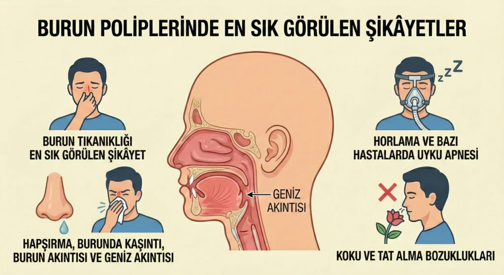 Burun poliplerinde en sık görülen şikâyet burun tıkanıklığıdır. Bunun yanında şu yakınmalar da eşlik edebilir: