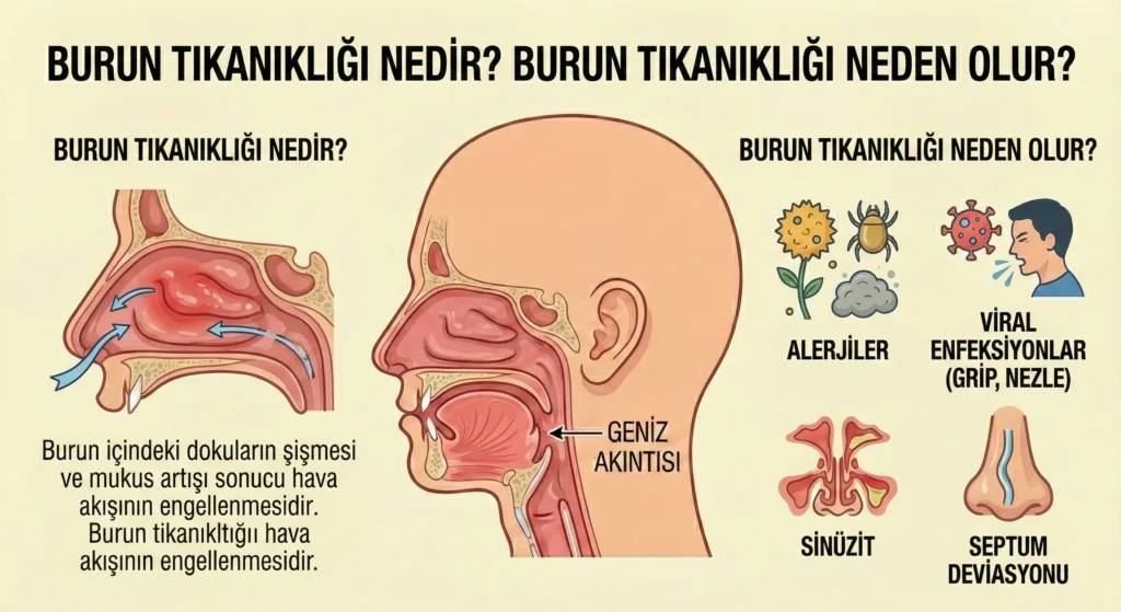 Burun tıkanıklığının tek bir sebebi olmayabilir. Özellikle bazı hastalarda birden fazla neden aynı anda bulunur (örneğin hem alerji hem septum eğriliği gibi). Bu yüzden doğru tanı, doğru tedavi için önemlidir.