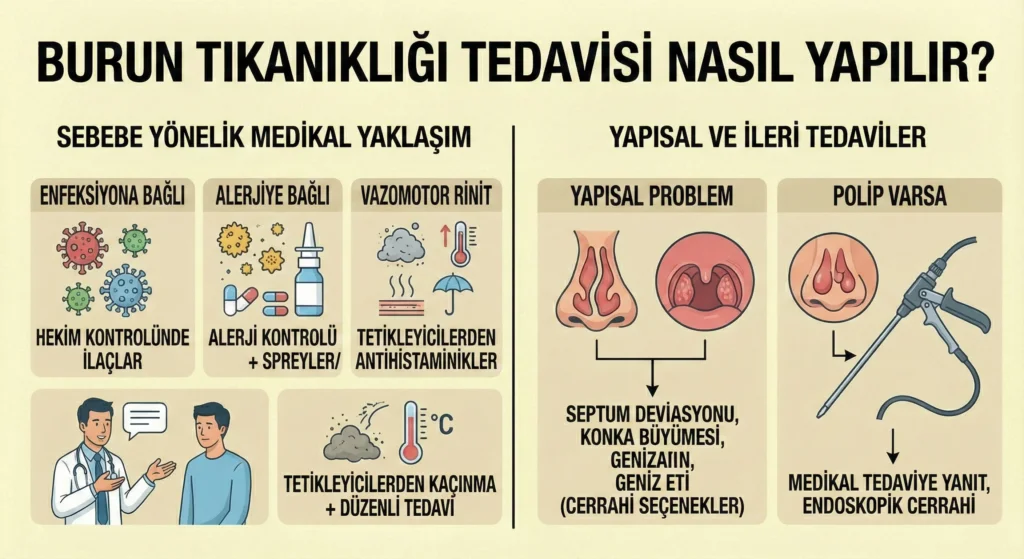 Tedavi, burun tıkanıklığının sebebine göre planlanır. Genel yaklaşım şu şekilde özetlenebilir: