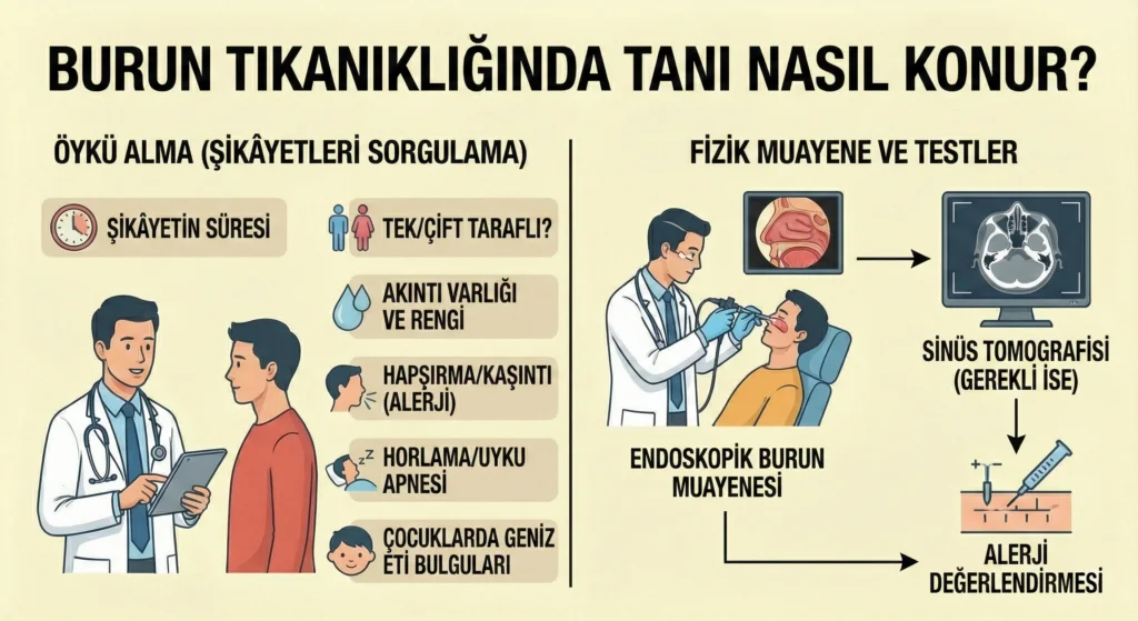 Burun tıkanıklığının nedenini netleştirmek için şu adımlar önemlidir: