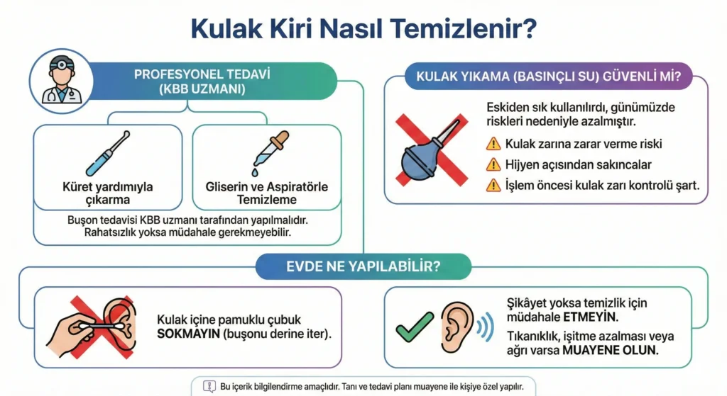 Kulak kiri her zaman “temizlenmesi gereken bir şey” değildir. Rahatsızlık vermiyorsa ve kulak yolunu tıkamıyorsa çoğu zaman çıkarılmasına gerek olmayabilir.