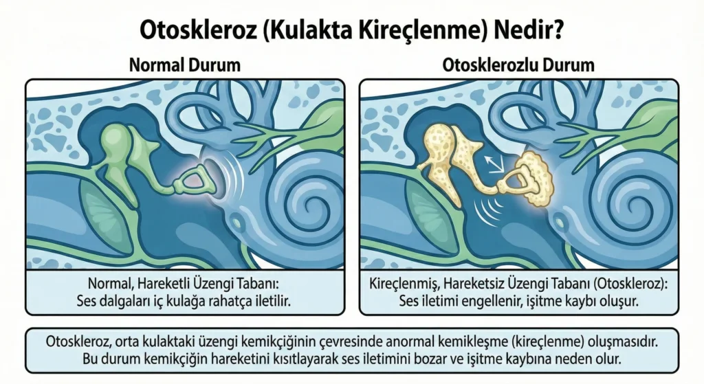 Otoskleroz, iç kulağı çevreleyen kemik kapsülde zamanla gelişen anormal kemik değişiklikleri (halk arasında “kireçlenme” olarak da ifade edilir) nedeniyle ortaya çıkan bir hastalıktır. Bu değişiklikler çoğunlukla üzengi kemikçiğinin (stapes) iç kulağa komşu olduğu bölgede olur. Üzengi kemikçiği ses titreşimlerini iç kulağa iletmek için hareket etmek zorundadır; otosklerozda bu hareket azalır veya tamamen durabilir.