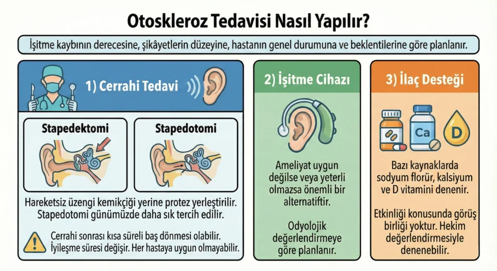 Otoskleroz tedavisi; işitme kaybının derecesine, şikâyetlerin düzeyine, hastanın genel durumuna ve beklentilerine göre planlanır. Başlıca seçenekler: