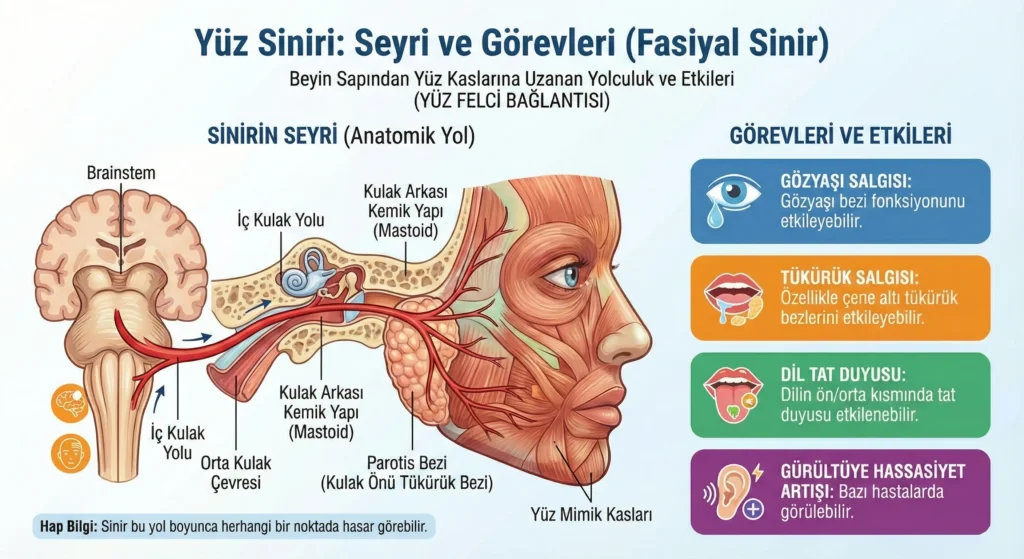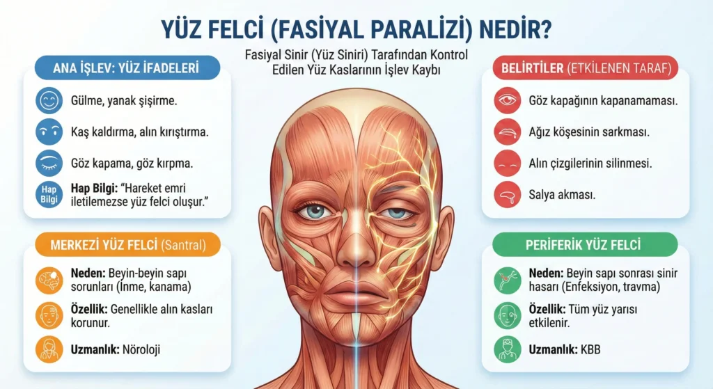 Yüz ifadesini sağlayan; kaş kaldırma, göz kapama, gülme, ıslık çalma, yanak şişirme gibi hareketleri yapan kasların siniri **fasiyal sinir (yüz siniri)**dir. Bu sinirin kendisinde veya beyin sapındaki çekirdeğinde oluşan etkilenmeye bağlı olarak yüz kaslarına giden “hareket emri” iletilemezse yüz felci (fasiyal paralizi) ortaya çıkar.