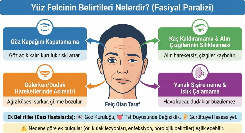 Nedene göre ek bulgular da eşlik edebilir (ör. kulakta lezyonlar, orta kulak iltihabı bulguları, başka nörolojik belirtiler). YÜZ FELCİ (FASYAL PARALİZİ)