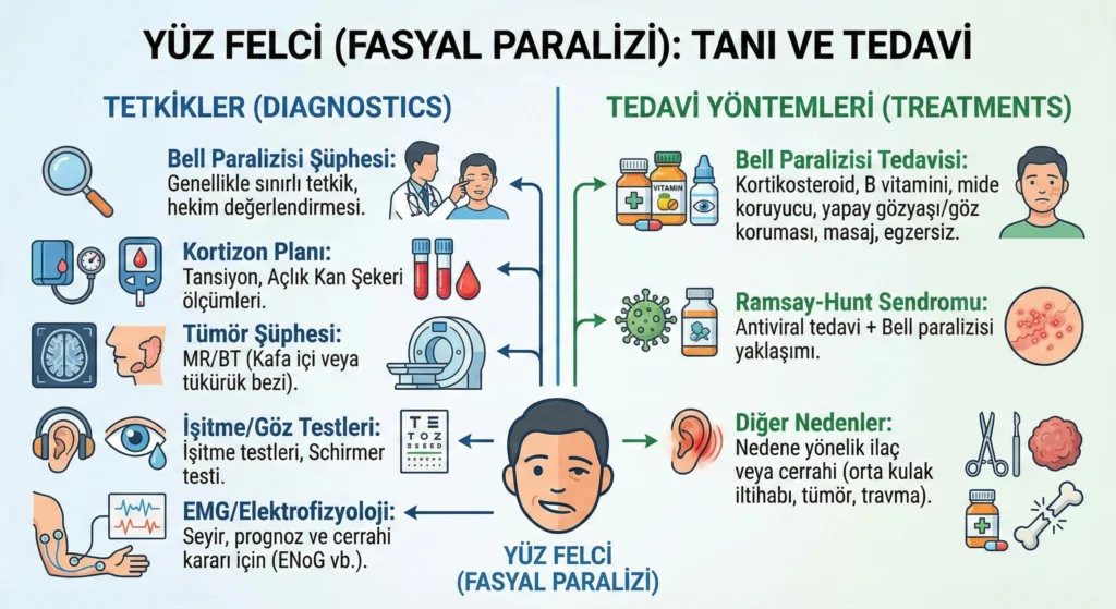 - EMG / elektrofizyolojik testler (ENoG vb.): Özellikle seyir, prognoz ve cerrahi kararı açısından yol gösterici olabilir. YÜZ FELCİ (FASYAL PARALİZİ)